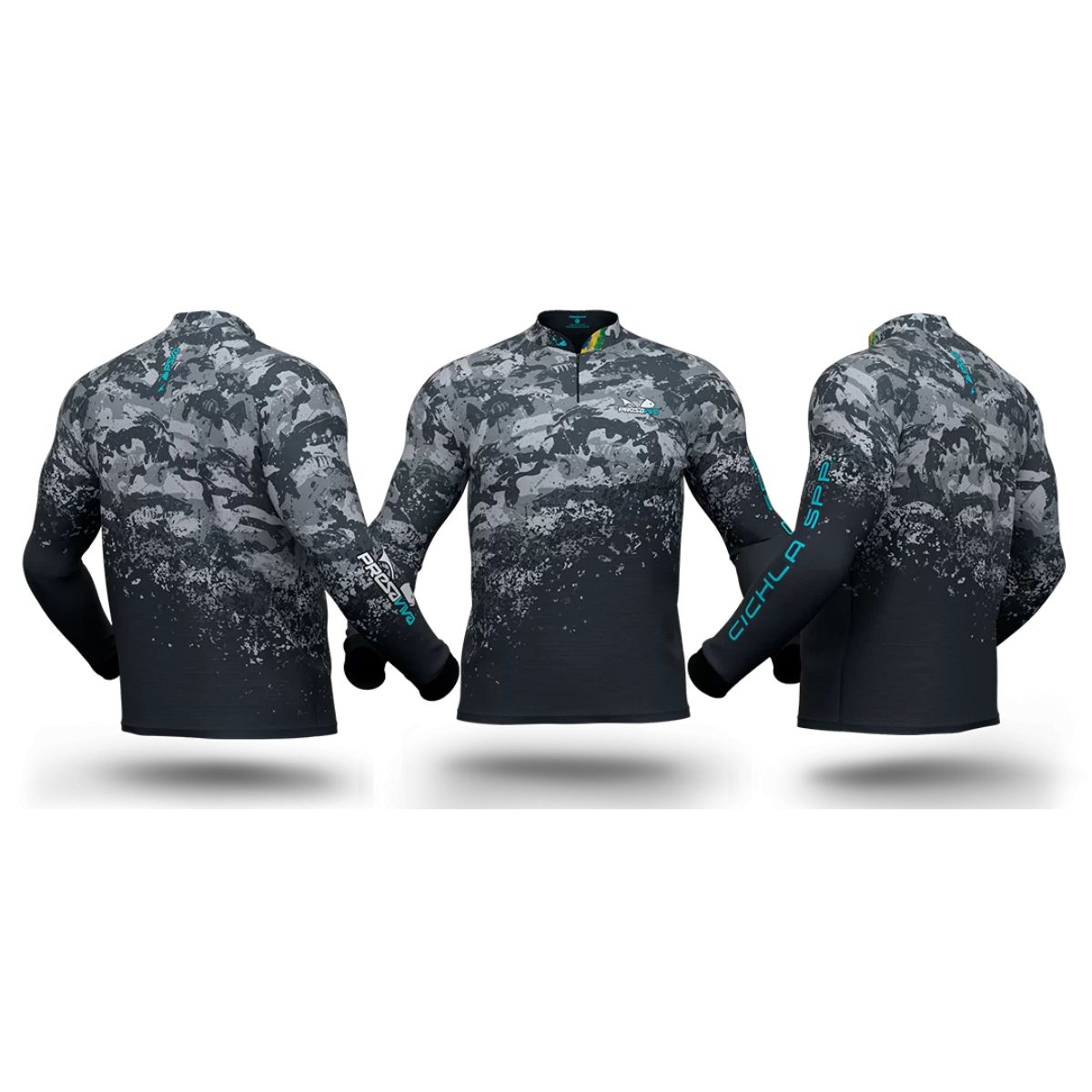 Camisa sublimada Presa Viva Tecnologia Dry, que proporciona máximo conformo térmico durante a atividade, modelo raglã manga longa, fechamento com zíper.